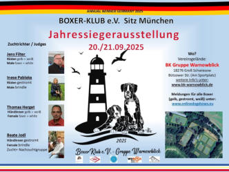 Datum Veranstalter Art der Veranstaltung Informationen 20./21.09.2025 Boxerklub e.V. Gruppe Warnowblick Jahressiegerausstellung 2025 www.bk-warnowblick.de